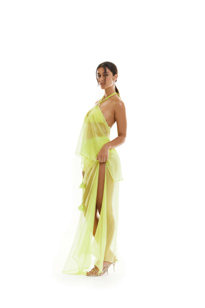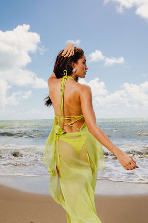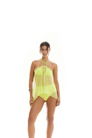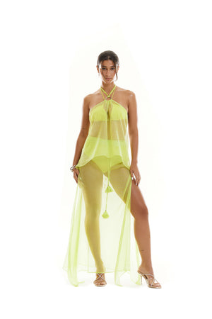 Blusa lima frente única e costas nuas com transparência e tecido plissê fluido.
