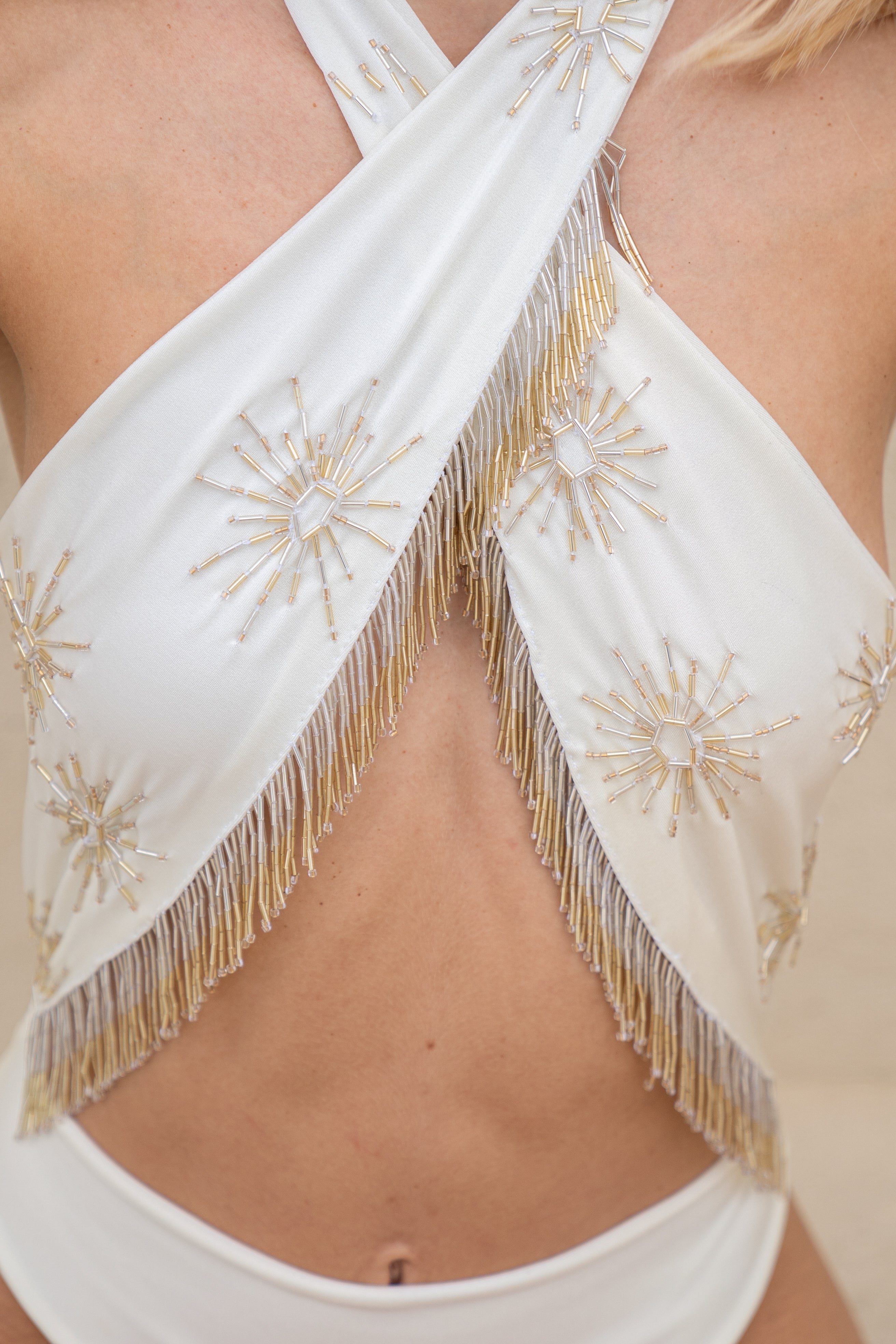O Body Sol Bordado é uma peça para quem aspira por um look cheio de detalhes. A delicadeza dos canutilhos e vidrilhos trazem uma tendência forte dos brilhos e sunset com os bordados inspirados em sol.