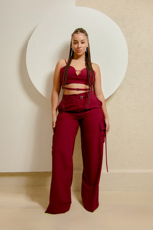 A calça Diana vinho combina a elegância do alfaiataria com detalhes modernos e funcionais, criando um visual sofisticado e prático para diversas ocasiões.