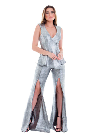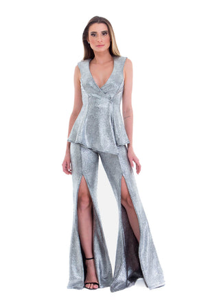 Calça flare com fendas frontais cintura alta prata texturizada.