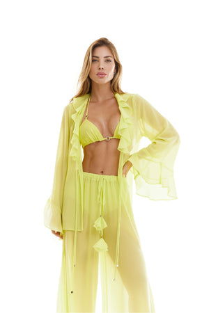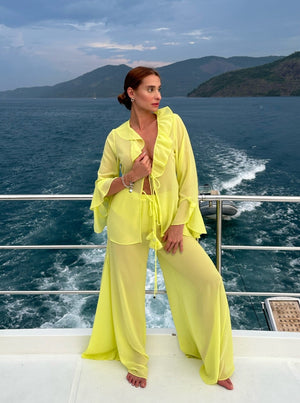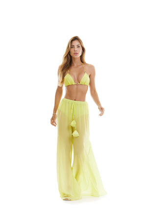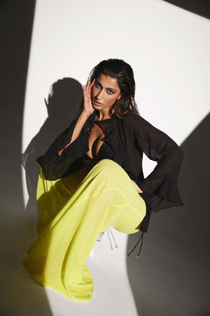 Calça pantalona lima com nesga lateral, transparência e tecido chiffon.