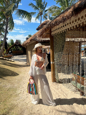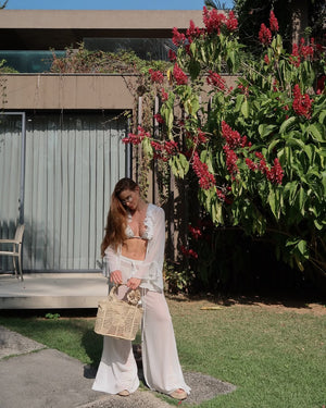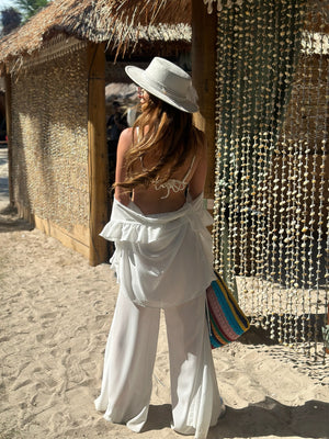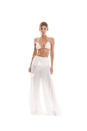 Calça pantalona off-white com nesga lateral, transparência e tecido chiffon.