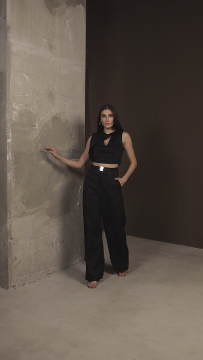 Calça em crepe premium com cinto removível com fivela metálica. Modelagem sofisticada e atemporal que valoriza a silhueta com elegância.