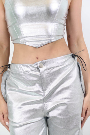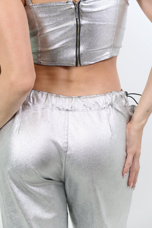 Calça estilo parachute de malha metalizada prata. Possui um zíper na frente e é regulável na cintura