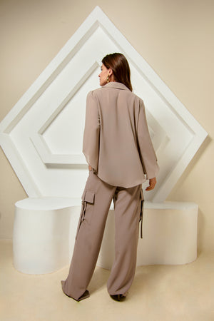 Camisa de chiffon na cor fendi de botões com transparência. Manga 3/4, assimétrica e flare e costas com detalhe também assimétrico. Acabamento em costura inglesa.