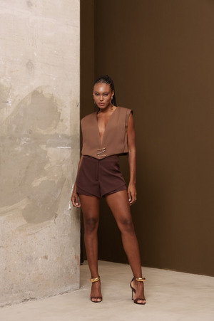 Colete em crepe premium com design estruturado e ombreiras. Uma peça marcante que traz sofisticação e ousadia na medida certa.