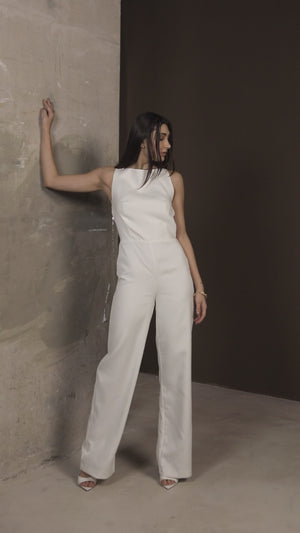 Macacão de crepe premium com costas nuas e capa removível, acompanhado de acessórios em metal banhado. Uma peça que une sensualidade e sofisticação, com modelagem fluida e contemporânea.