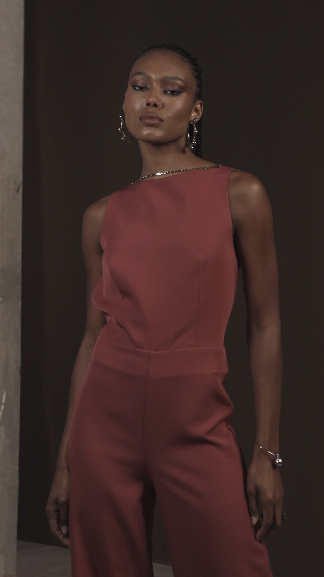 Macacão de crepe premium com costas nuas e capa removível, acompanhado de acessórios em metal banhado. Uma peça que une sensualidade e sofisticação, com modelagem fluida e contemporânea.