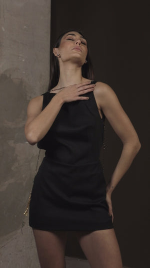 Macaquinho short saia em crepe premium, com capa fluida removível e detalhe em acessório banhado em metal. O contraste entre a leveza da capa chiffon e o design arquitetônico da alfaiataria cria uma peça versátil e impactante, perfeita para diferentes ocasiões.