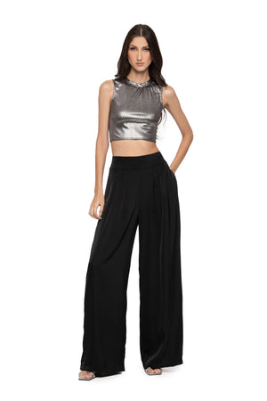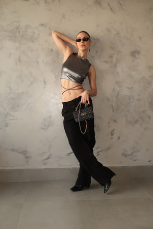 A Regata cropped Alicia grafite além de ser uma peça básica é uma peça super fashion. Com sua malha canelada e metalizada faz-se uma peça coringa e ao mesmo única. A tendência do corselet, super forte em 2024, aparece nas costas com a amarração. A regata faz o match perfeito com a Calça Zoe, se adicionar um salto alto de bico fino se torna uma produção sofisticada e cool.