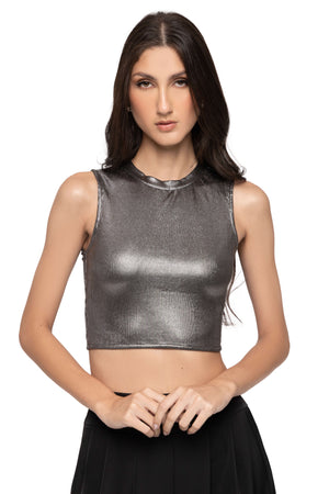 Regata cropped costas nuas grafite de malha canelada metalizada