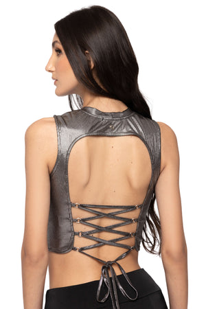 Regata cropped costas nuas grafite de malha canelada metalizada e shape justinho costas nuas com detalhes de ilhós e tira longa cruzada estilo corset.