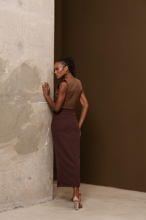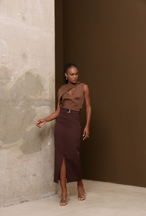 Saia midi em crepe premium com fenda frontal e cinto removível em metal. Atemporal e elegante, é ideal tanto para produções clássicas quanto modernas, especialmente quando combinada com nosso Top Zaha.
