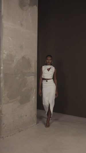 Saia midi em crepe premium com fenda frontal e cinto removível em metal. Atemporal e elegante, é ideal tanto para produções clássicas quanto modernas, especialmente quando combinada com nosso Top Zaha.