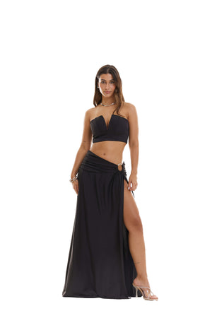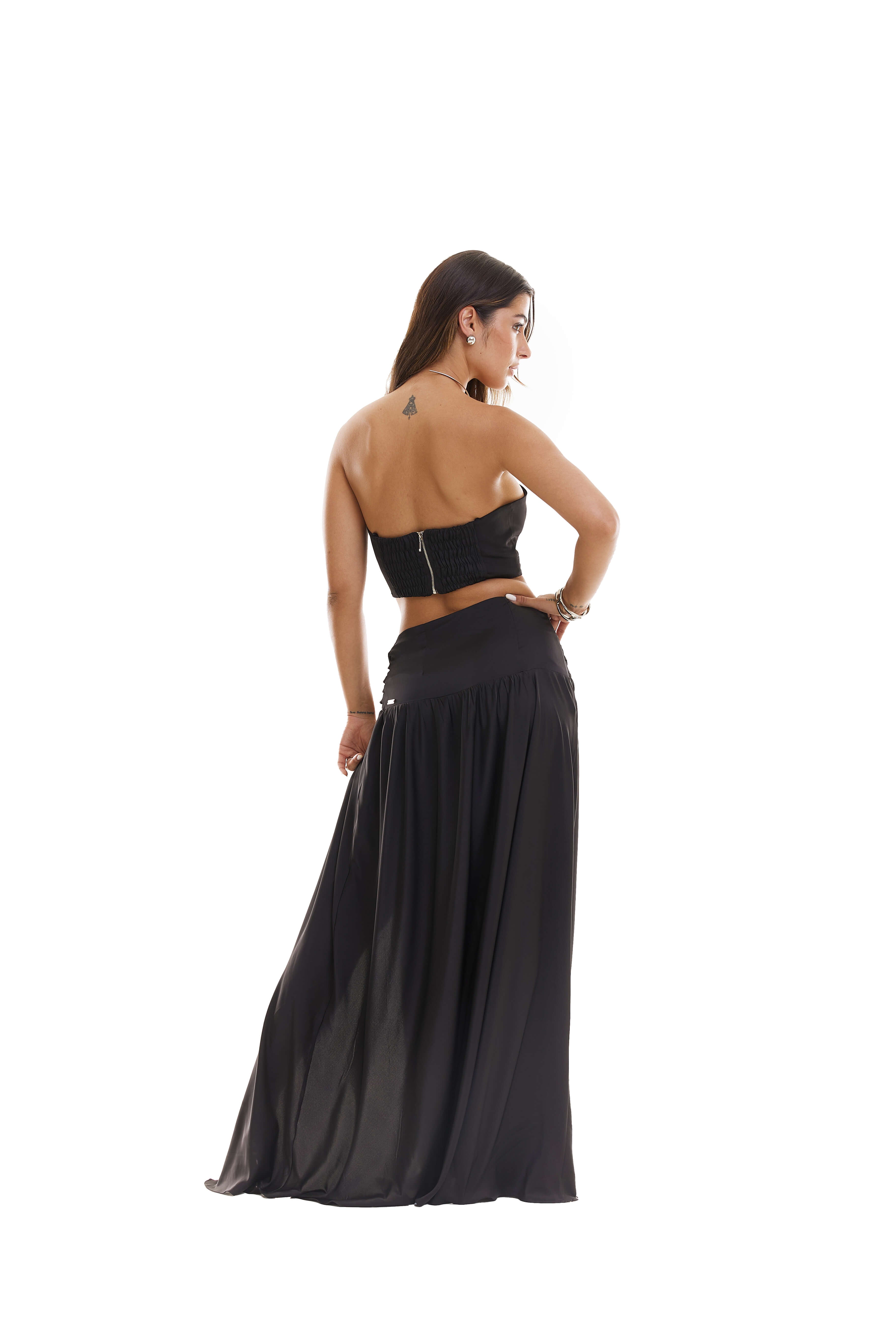 Saia longa na cor preta com o tecido de cetim de seda.