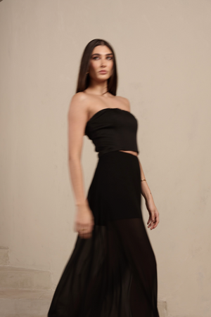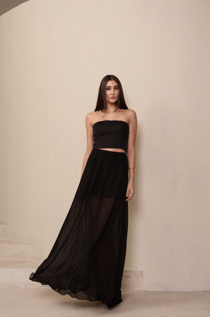 Saia longa confeccionada em chiffon leve e fluido, que garante movimento e sofisticação. Uma peça versátil que pode ser usada sozinha ou em conjunto com outras sobreposições, criando desde produções despojadas até visuais sofisticados.