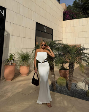 Saia longa de cetim com zíper invisível na lateral, acabamento em viés e cós entretelado. Perfeita para dias mais quentes.