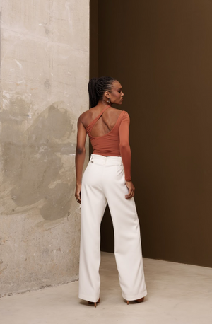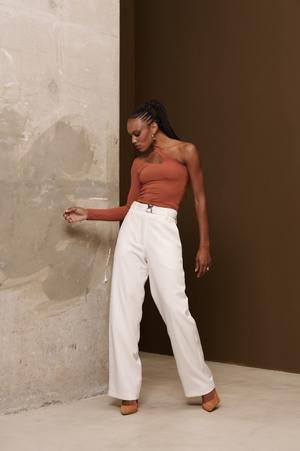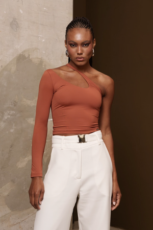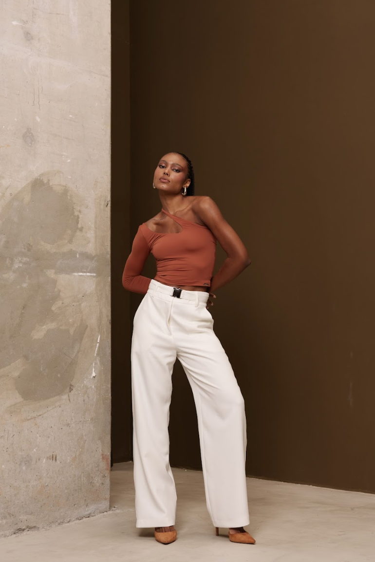 Blusa assimétrica em malha fluity, com recortes estratégicos e design contemporâneo. O detalhe de uma manga longa contrasta com a assimetria elegante, tornando a peça sofisticada e cheia de personalidade.