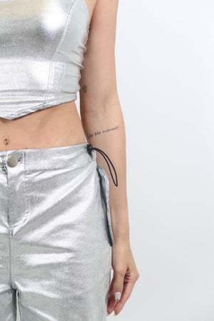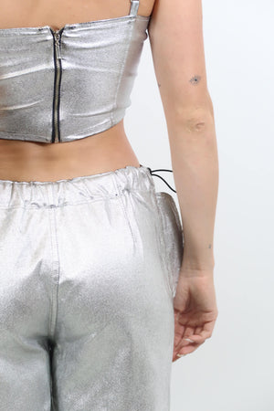 Top cropped estilo corpete de malha metalizada prata com alça regulável e zíper nas costas.