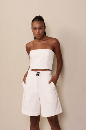 Top tomara-que-caia em alfaiataria sofisticada, acompanha peplum removível e faixa longa que permitem diferentes formas de uso. Uma peça versátil e elegante que transita do casual ao refinado com facilidade.