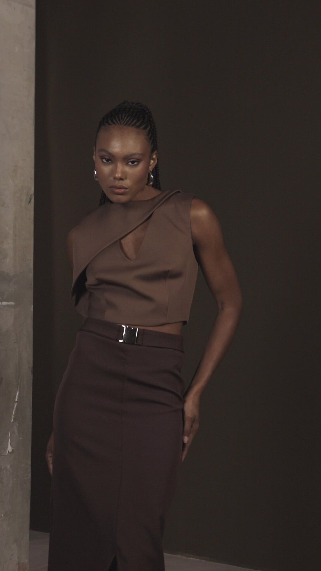 Top em crepe premium com modelagem assimétrica e detalhe arquitetônico na gola. Uma peça sofisticada que une design moderno e versatilidade, podendo ser usada de duas formas diferentes.