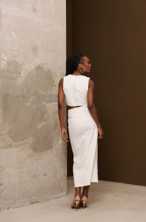 Top em crepe premium com modelagem assimétrica e detalhe arquitetônico na gola. Uma peça sofisticada que une design moderno e versatilidade, podendo ser usada de duas formas diferentes.