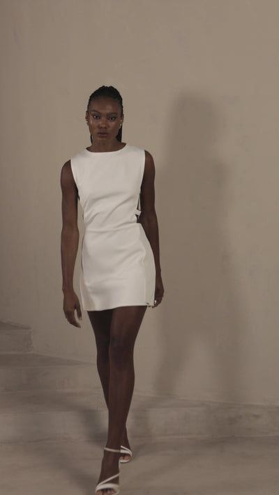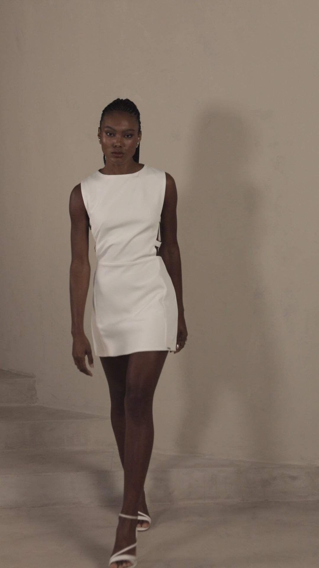 Vestido curto em crepe premium com recortes laterais e fivelas banhadas em prata. Uma peça ousada e sofisticada que valoriza a silhueta feminina.