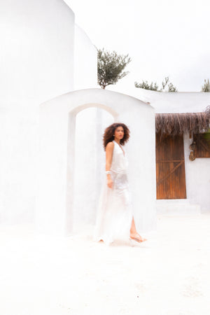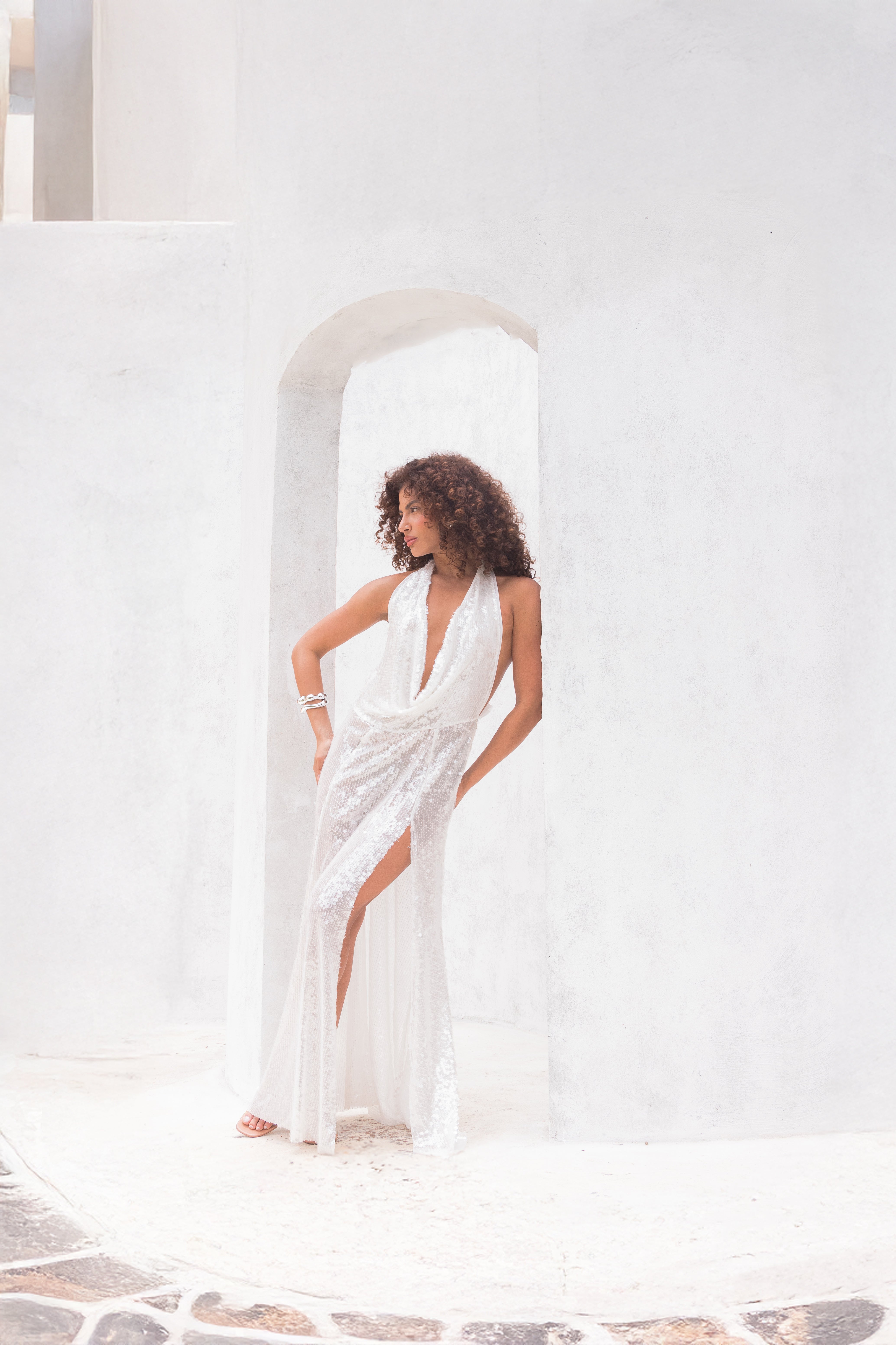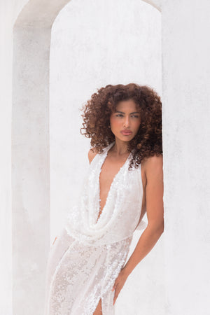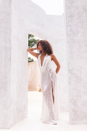 Vestido longo na cor Off White em Paetê, frente única com decote degagê e costas nuas.