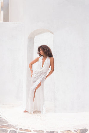 Vestido longo na cor Off White em Paetê, frente única com decote degagê e costas nuas. Possui fenda e amarração no pescoço com ponteiras de flores e forro em chiffon no decote. Fechamento com zíper invisível na lateral.