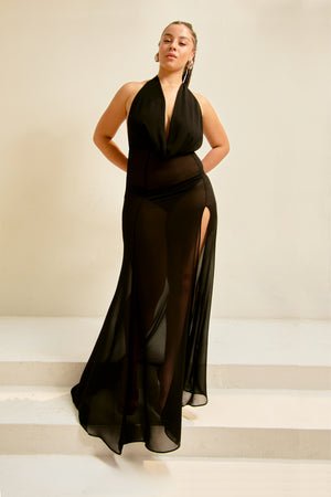 Vestido longo na cor preta com tecido chiffon, frente única com decote degagê e costas nuas.