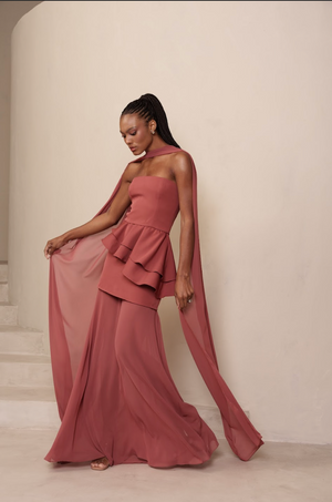 Vestido modular em tecido de caimento leve que se desmembra em cinco peças, permitindo inúmeras combinações. O Top Lina estruturado, conta comas sobreposições de peplum e faixa longa fluida criam um visual moderno e elegante — unindo com Mini Saia...