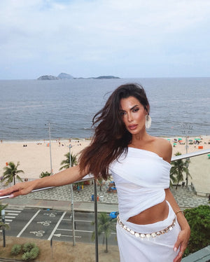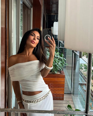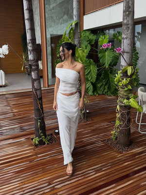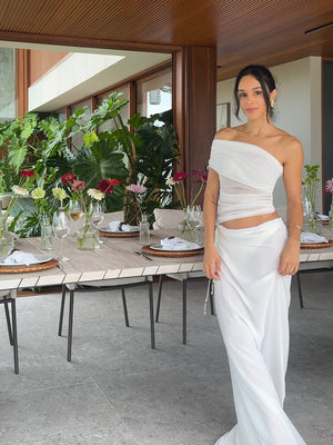 Para a Noite: Use com um scarpin, para alongar a silhueta e dar um toque de glamour ao look. O detalhe drapeado da saia cria um movimento encantador, e o acessório removível em pérolas pode ser deixado no look para um toque extra de sofisticação. Complete com uma clutch elegante e brincos de pérolas.