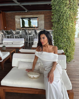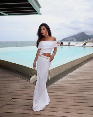 Para o Verão: Apesar de ser um vestido longo, sua saia de chiffon traz leveza e frescor, sendo ideal para eventos de verão. Para uma ocasião mais casual, combine com sandálias rasteiras ou de salto bloco para um visual mais confortável e cheio de charme. Uma bolsa de mão estilosa e óculos de sol completam o look. O detalhe drapeado na lateral e o toque de pérolas deixam o visual sofisticado sem perder a leveza, perfeito para um evento ao ar livre.